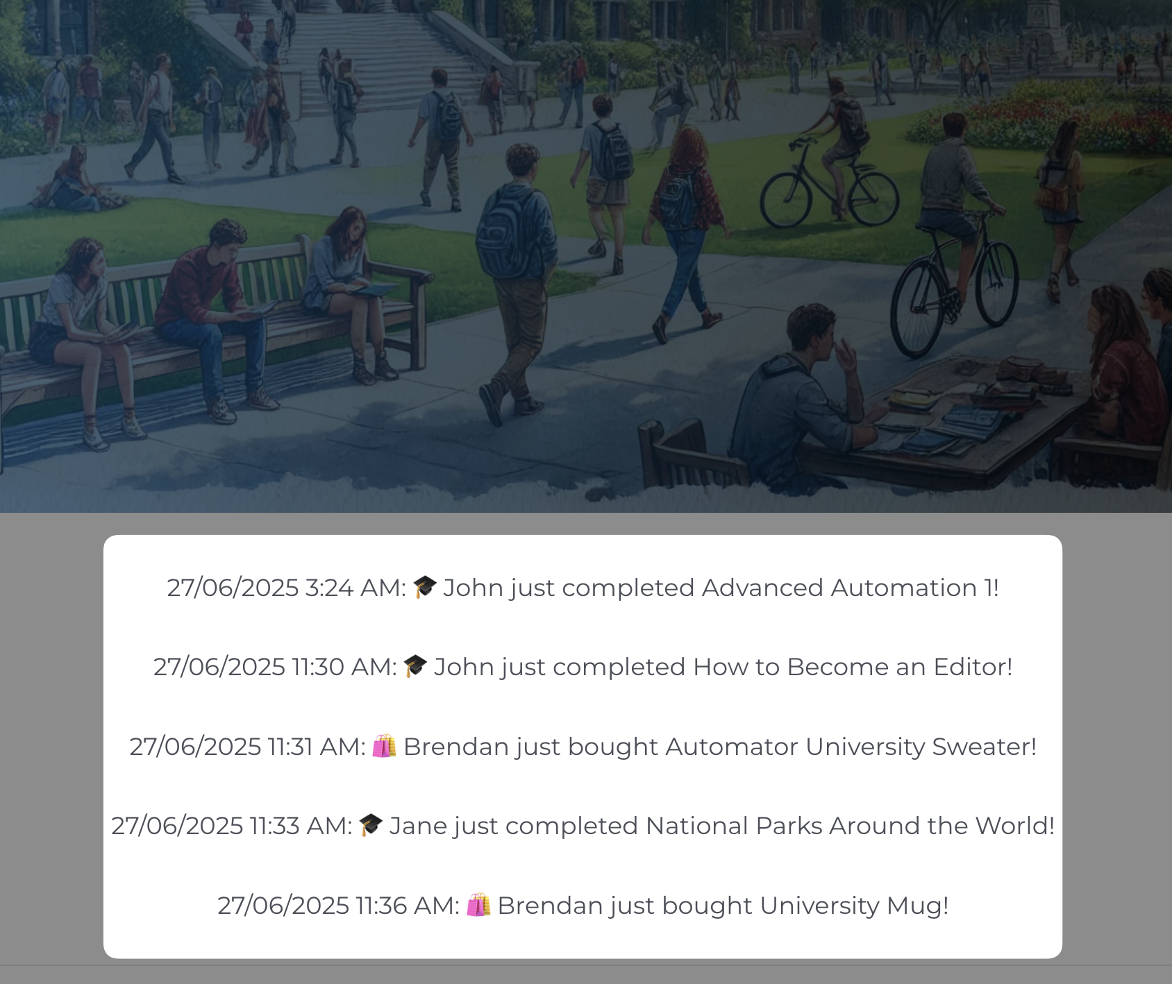Of course, a lot more than course completions happens on our website. So, we created additional recipes for quiz completions, event registrations, purchases, and more. Even with minimal styling, here’s how our activity stream looks: