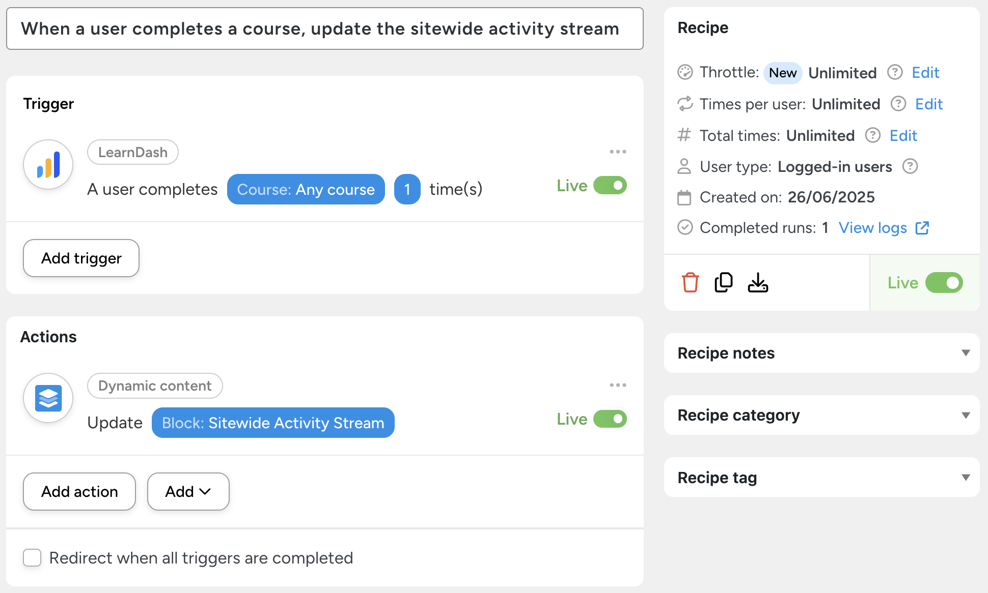 Give your recipe a name that makes it easy to recognize at a glance. For example, we have named this recipe “When a user completes a course, update the sitewide activity stream”.