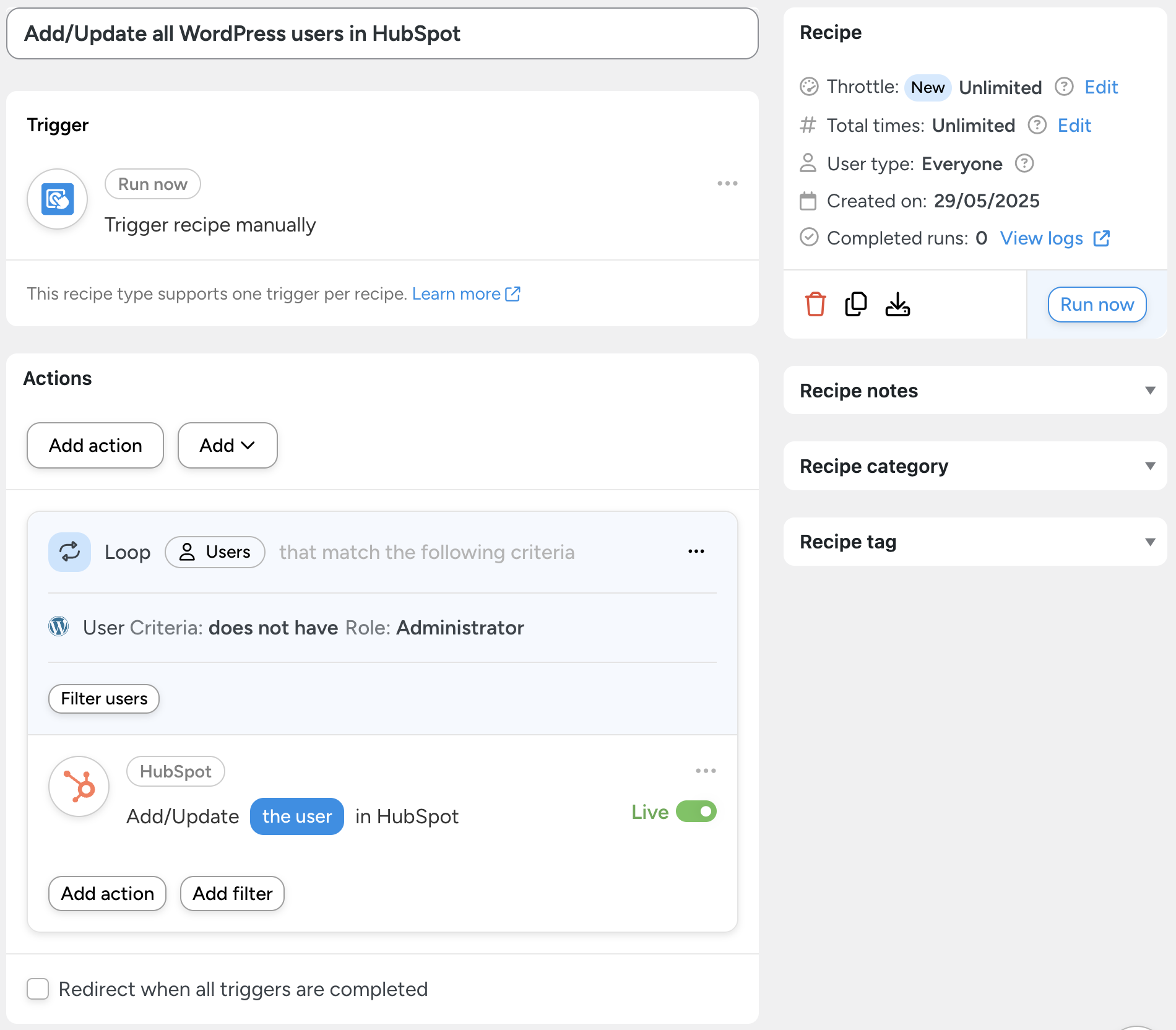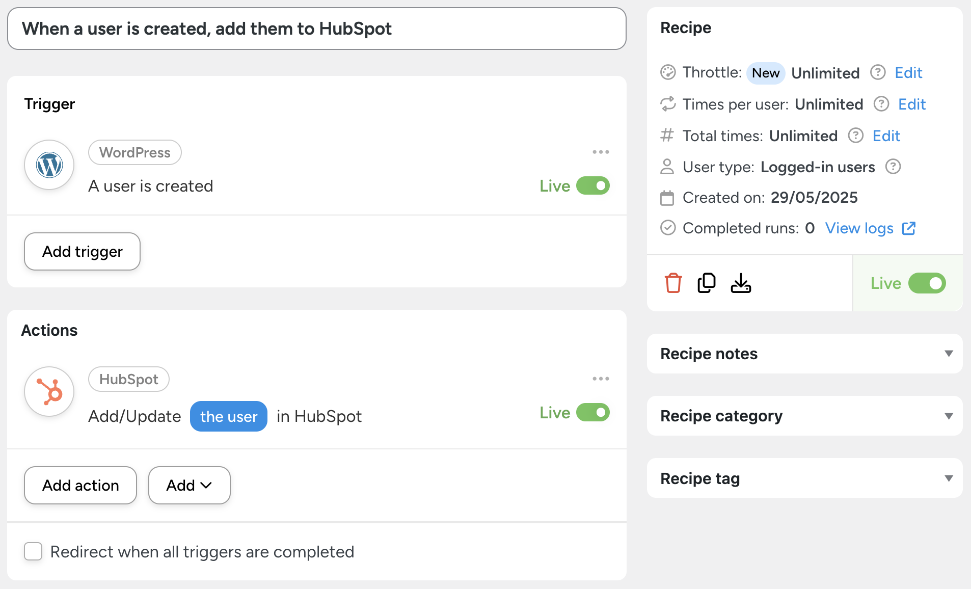You’re just about ready to connect HubSpot to WordPress. All you have to do is toggle the recipe from Draft to Live.