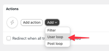- Now, inside the user loop (and this is very important, use the button inside the loop section and not the button at the top of the Actions section), click Add action.