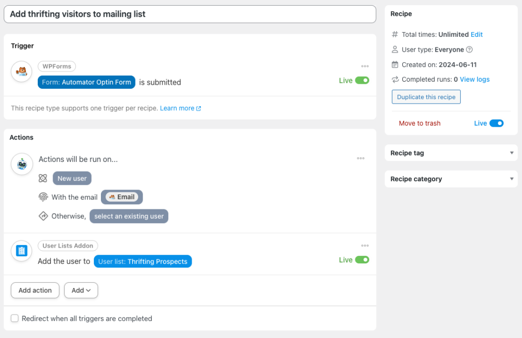 - Name your recipe. It should be something identifiable, so I might use something like, “Add thrifting visitors to mailing list”.