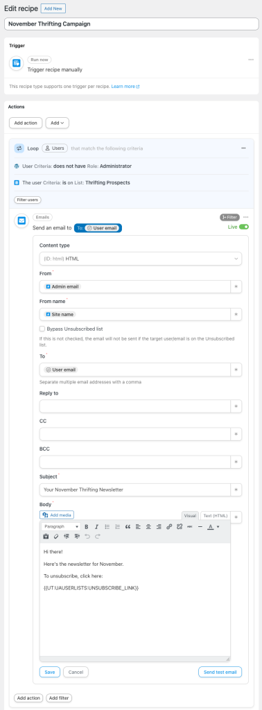 The last automation that we’ll cover in this article is sending an email campaign to users in the list we created. Doing this, of course, will involve another Uncanny Automator recipe. For this one, we will run a recipe instantly (on demand rather than with some kind of user activity on the site) that will “loop” through users in the mailing list and send each of them an email.