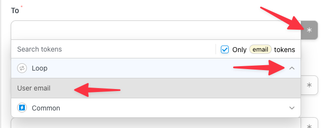 - For this example, we’ll focus on the key fields for the email. The first one is who to send the email to, and for this we need to target the email address of users in the loop (so users on our mailing list). In the token list for the To field, choose the User email option in the Loop set of tokens, like this: