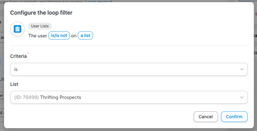 - In the modal that pops up, leave the criteria as “is” and choose the list you created. For my example list of thrifting prospects, the selection will look like this: