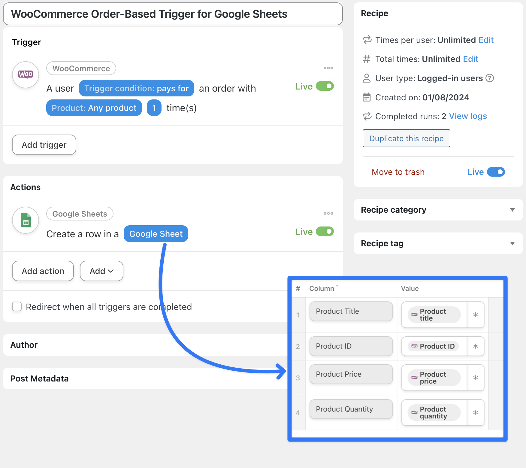 To better understand product-based triggers, here is a look at a recipe with the trigger Any product has its associated order paid for and the Google Sheets action Create a row in a Google Sheet.