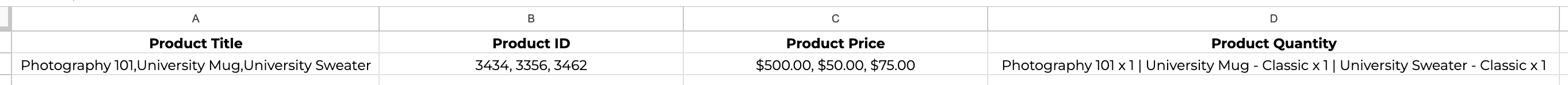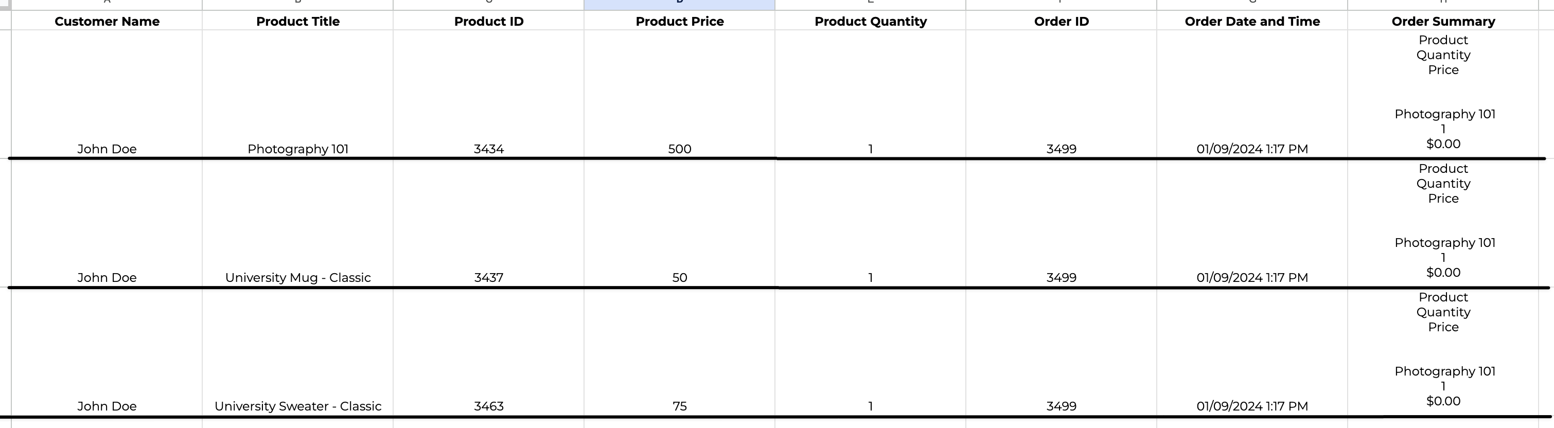 Looking at the “Order ID”, “Order Date and Time” and “Order Summary” columns, it might appear that Automator duplicated the data. However, the order data for each product is only identical because the products that caused the recipe to run were paid for in the same order.